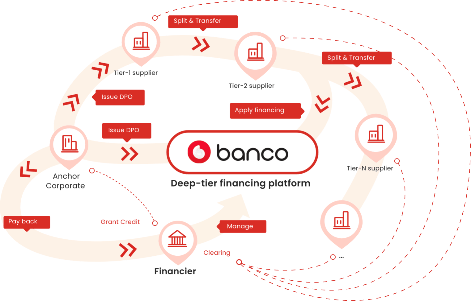 Unlike other supply chain programmes currently in the market, banco's innovative solution allows value to be transferred to the deeper realms of the supply chain and as a result, expand your early financing programme to benefit more suppliers in your ecosystem. More happy suppliers, stronger supply chain.